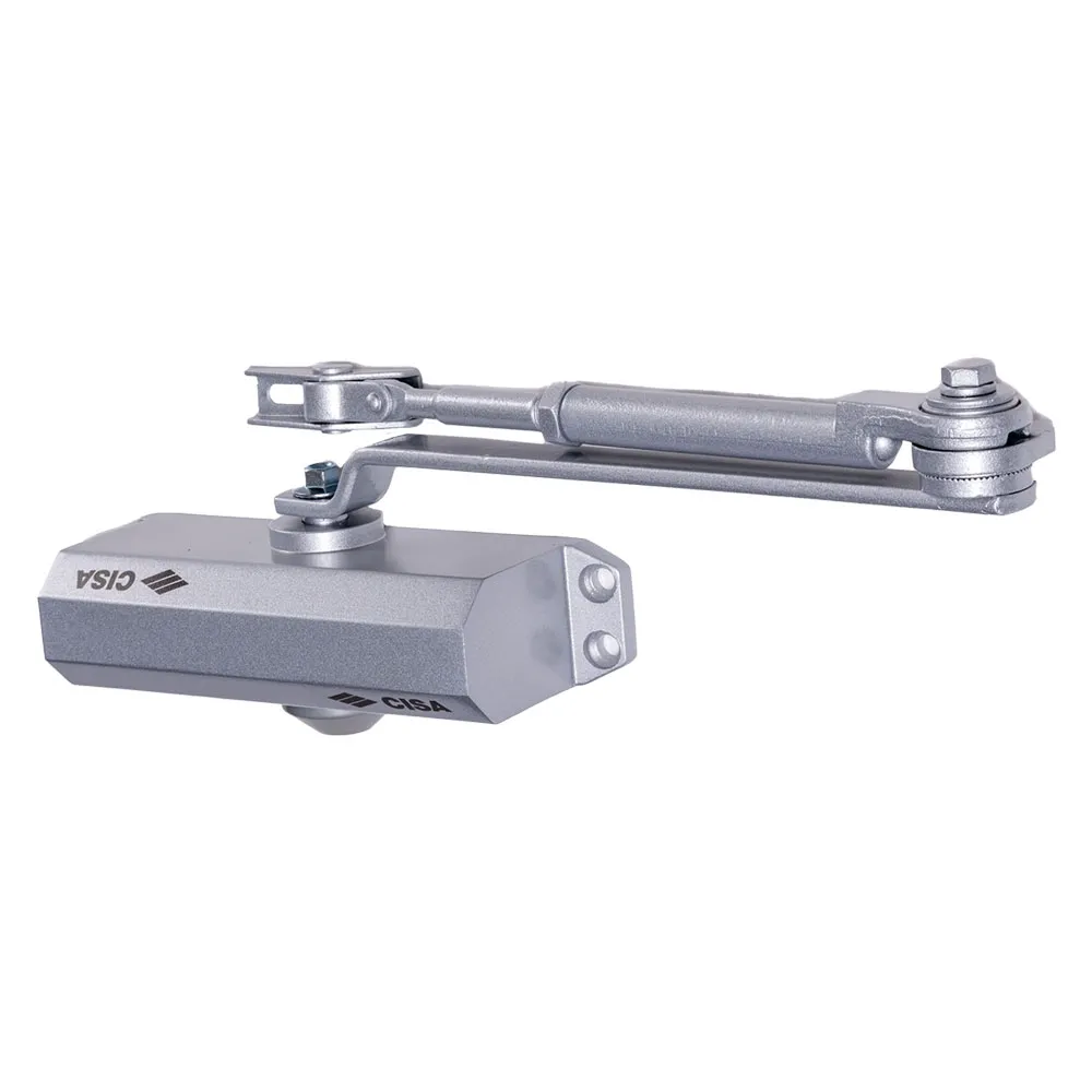 Corpo in lega di alluminio. Meccanismo a pignone e cremagliera. Braccetto in acciaio, molla speciale in acciaio a bagno d'olio. Valvola di regolazione della velocita' di chiusura e valvola di regolazione del colpo finale. Per porte destre o sinistre, a tirare o a spingere con max 1100 mm di larghezza. Forza di chiusura regolabile da EN 2 a EN 4.